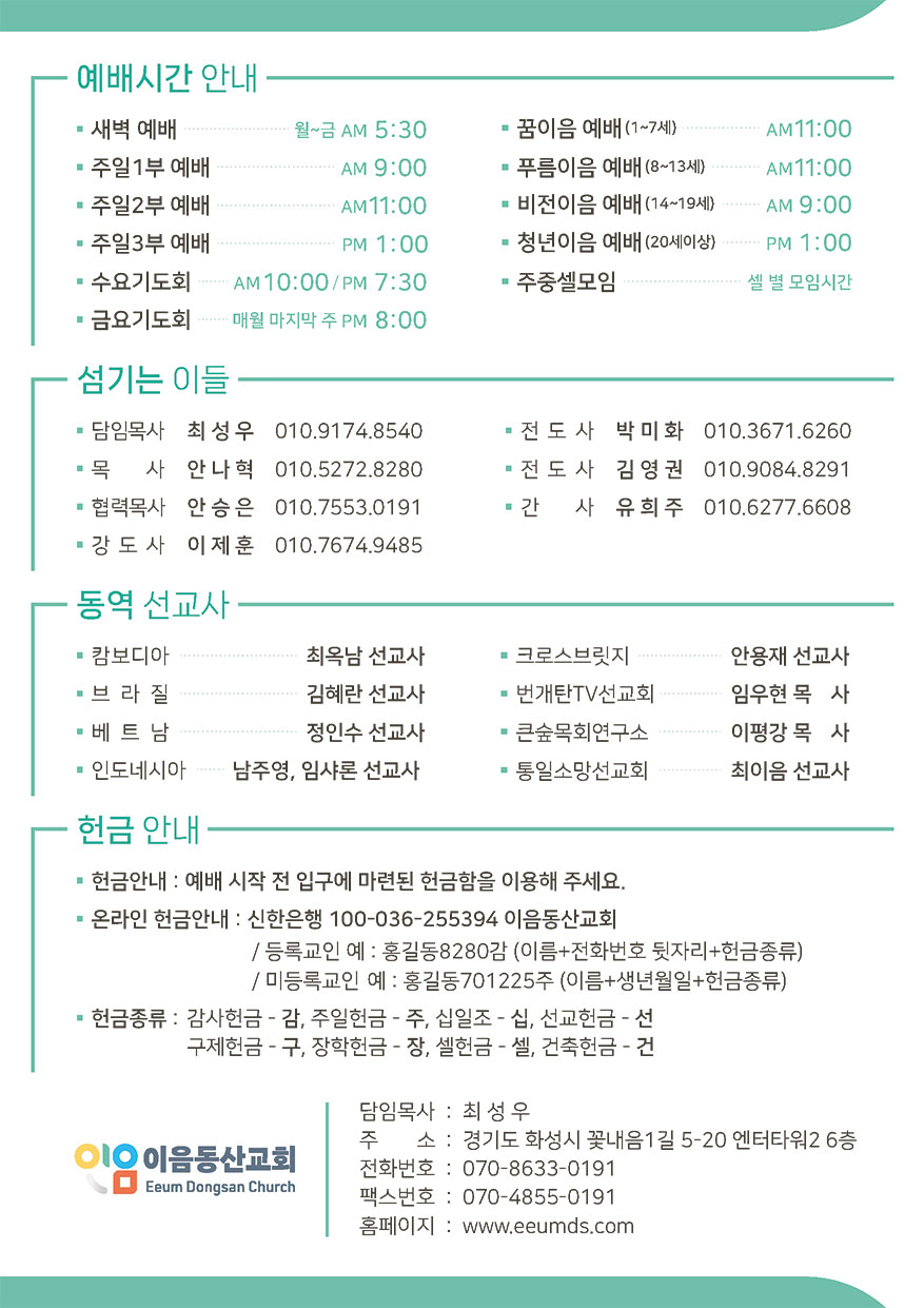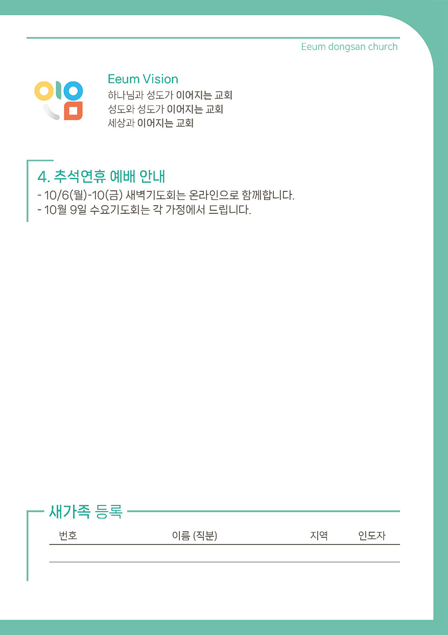 2025년 10월 05일 주일예배 주보 이음동산교회2025-10-04T09:34:44+09:00 관련 글 2025년 10월 12일 주일예배 주보 2025년 10월 12일 주일예배 주보 2025년 10월 11일 | 0 댓글 2025년 09월 28일 주일예배 주보 2025년 09월 28일 주일예배 주보 2025년 9월 26일 | 0 댓글 2025년 09월 21일 주일예배 주보 2025년 09월 21일 주일예배 주보 2025년 9월 19일 | 0 댓글 2025년 09월 14일 주일예배 주보 2025년 09월 14일 주일예배 주보 2025년 9월 12일 | 0 댓글 2025년 09월 07일 주일예배 주보 2025년 09월 07일 주일예배 주보 2025년 9월 5일 | 0 댓글