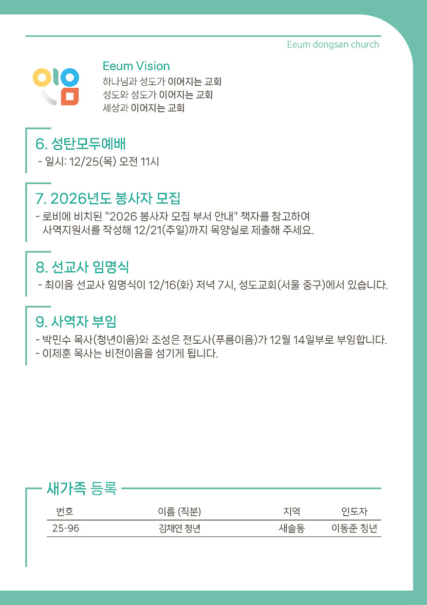 2025년 12월 14일 주일예배 주보 이음동산교회2025-12-12T16:31:26+09:00 관련 글 2025년 12월 07일 주일예배 주보 2025년 12월 07일 주일예배 주보 2025년 12월 5일 | 0 댓글 2025년 11월 27일 주일예배 주보 2025년 11월 27일 주일예배 주보 2025년 11월 27일 | 0 댓글 2025년 11월 23일 주일예배 주보 2025년 11월 23일 주일예배 주보 2025년 11월 22일 | 0 댓글 2025년 11월 16일 주일예배 주보 2025년 11월 16일 주일예배 주보 2025년 11월 14일 | 0 댓글 2025년 11월 09일 주일예배 주보 2025년 11월 09일 주일예배 주보 2025년 11월 8일 | 0 댓글