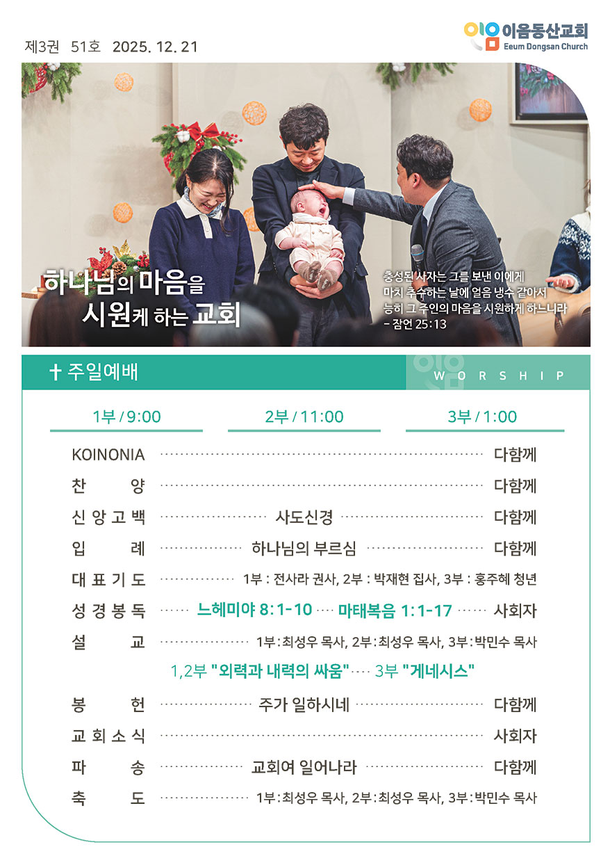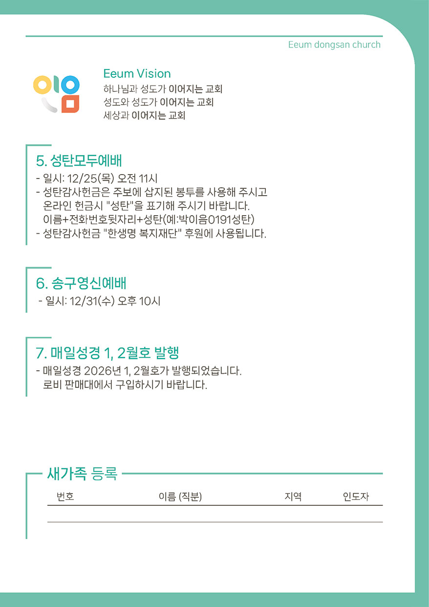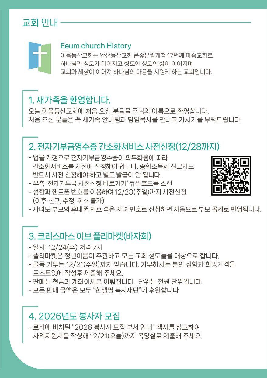 2025년 12월 21일 주일예배 주보 이음동산교회2025-12-19T11:34:02+09:00 관련 글 2025년 12월 14일 주일예배 주보 2025년 12월 14일 주일예배 주보 2025년 12월 12일 | 0 댓글 2025년 12월 07일 주일예배 주보 2025년 12월 07일 주일예배 주보 2025년 12월 5일 | 0 댓글 2025년 11월 27일 주일예배 주보 2025년 11월 27일 주일예배 주보 2025년 11월 27일 | 0 댓글 2025년 11월 23일 주일예배 주보 2025년 11월 23일 주일예배 주보 2025년 11월 22일 | 0 댓글 2025년 11월 16일 주일예배 주보 2025년 11월 16일 주일예배 주보 2025년 11월 14일 | 0 댓글