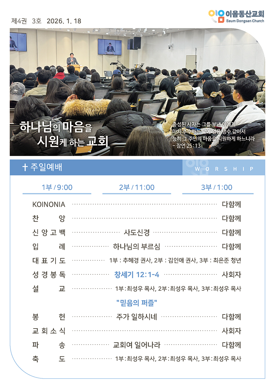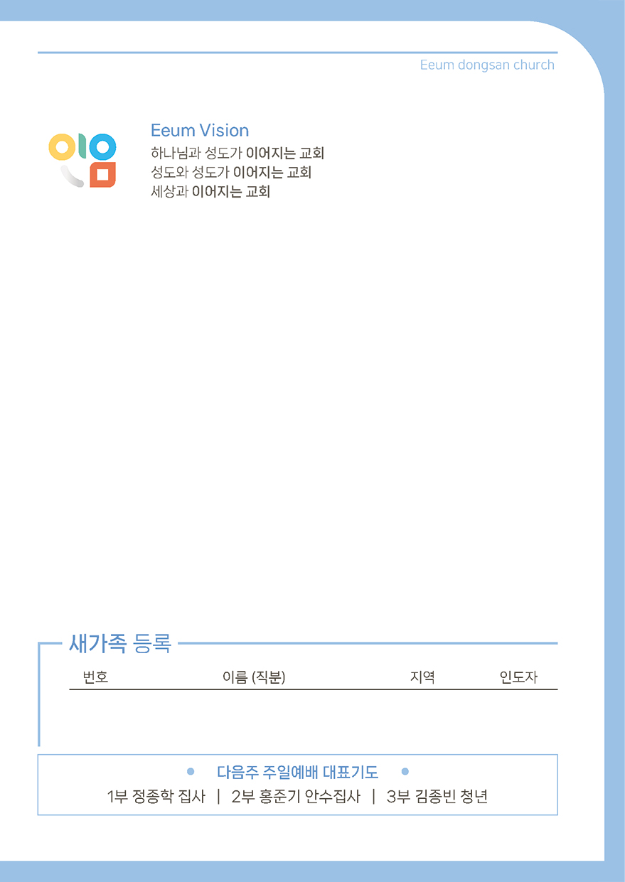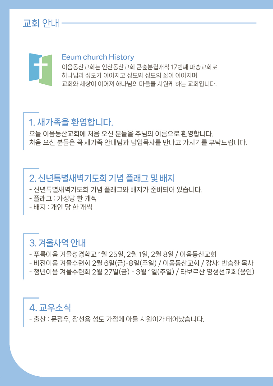 2026년 01월 18일 주일예배 주보 이음동산교회2026-01-16T07:21:09+09:00 관련 글 2026년 01월 11일 주일예배 주보 2026년 01월 11일 주일예배 주보 2026년 1월 9일 | 0 댓글 2026년 01월 04일 주일예배 주보 2026년 01월 04일 주일예배 주보 2026년 1월 2일 | 0 댓글 2025년 12월 28일 주일예배 주보 2025년 12월 28일 주일예배 주보 2025년 12월 23일 | 0 댓글 2025년 12월 21일 주일예배 주보 2025년 12월 21일 주일예배 주보 2025년 12월 19일 | 0 댓글 2025년 12월 14일 주일예배 주보 2025년 12월 14일 주일예배 주보 2025년 12월 12일 | 0 댓글