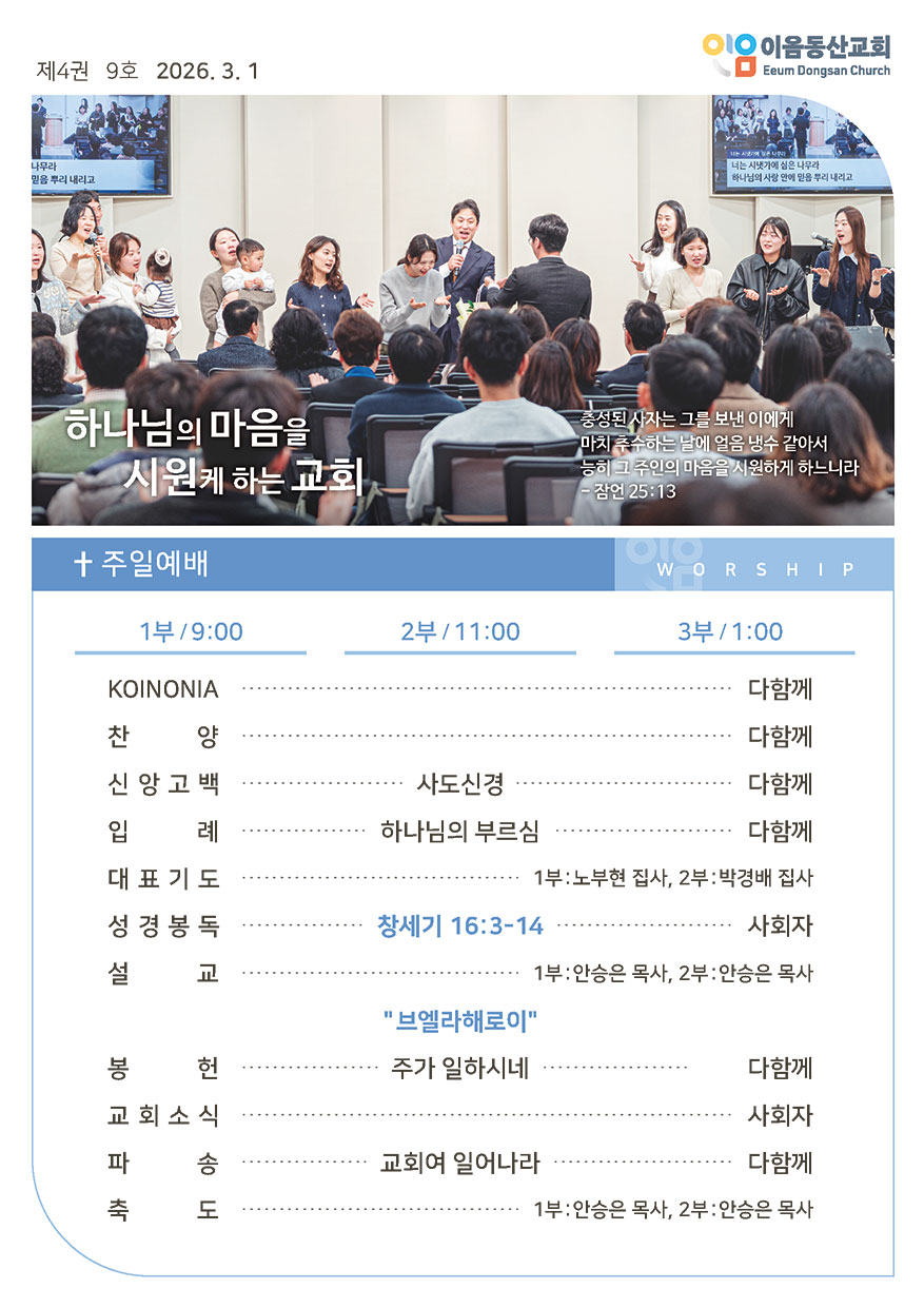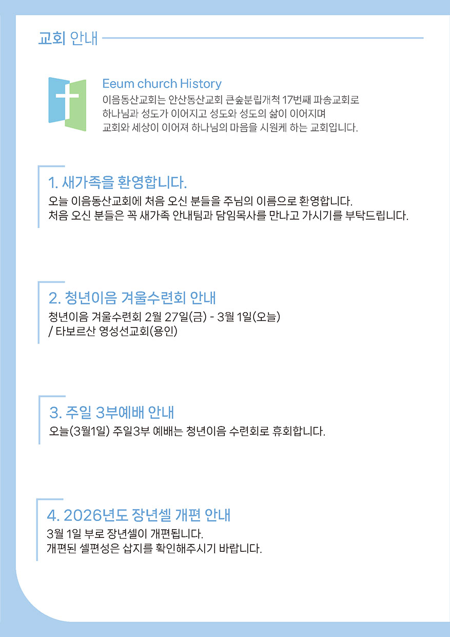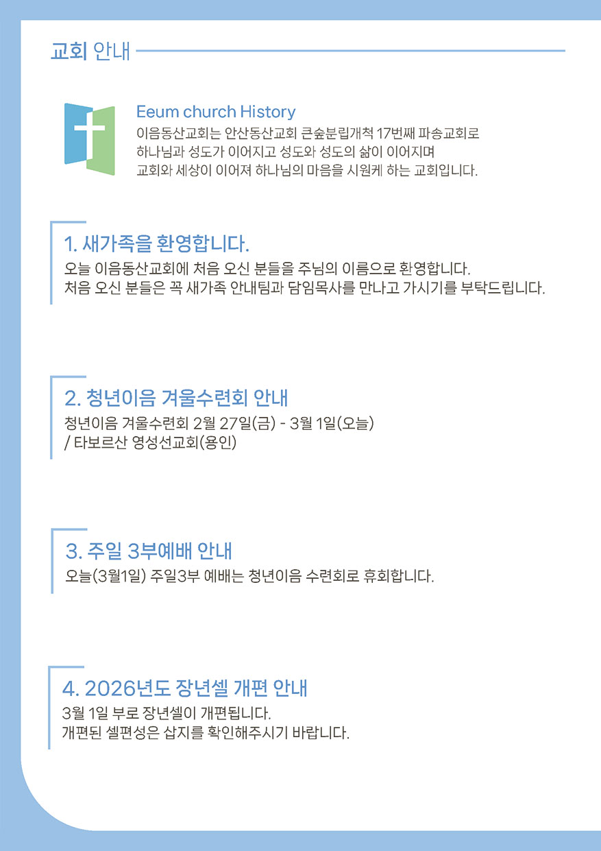 2026년 03월 01일 주일예배 주보 이음동산교회2026-02-28T14:43:55+09:00 관련 글 2026년 02월 22일 주일예배 주보 2026년 02월 22일 주일예배 주보 2026년 2월 19일 | 0 댓글 2026년 02월 15일 주일예배 주보 2026년 02월 15일 주일예배 주보 2026년 2월 14일 | 0 댓글 2026년 02월 08일 주일예배 주보 2026년 02월 08일 주일예배 주보 2026년 2월 6일 | 0 댓글 2026년 02월 01일 주일예배 주보 2026년 02월 01일 주일예배 주보 2026년 2월 2일 | 0 댓글 2026년 01월 25일 주일예배 주보 2026년 01월 25일 주일예배 주보 2026년 1월 23일 | 0 댓글