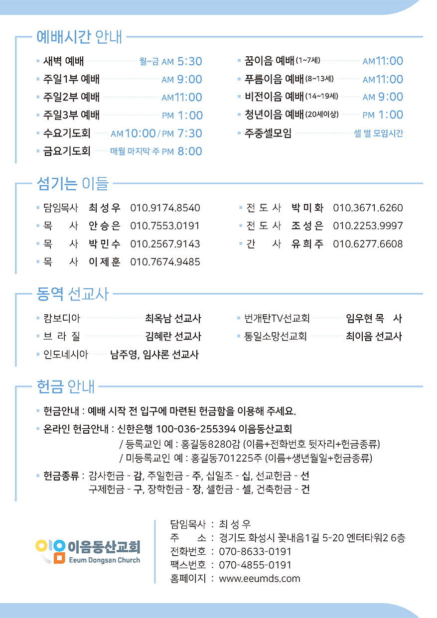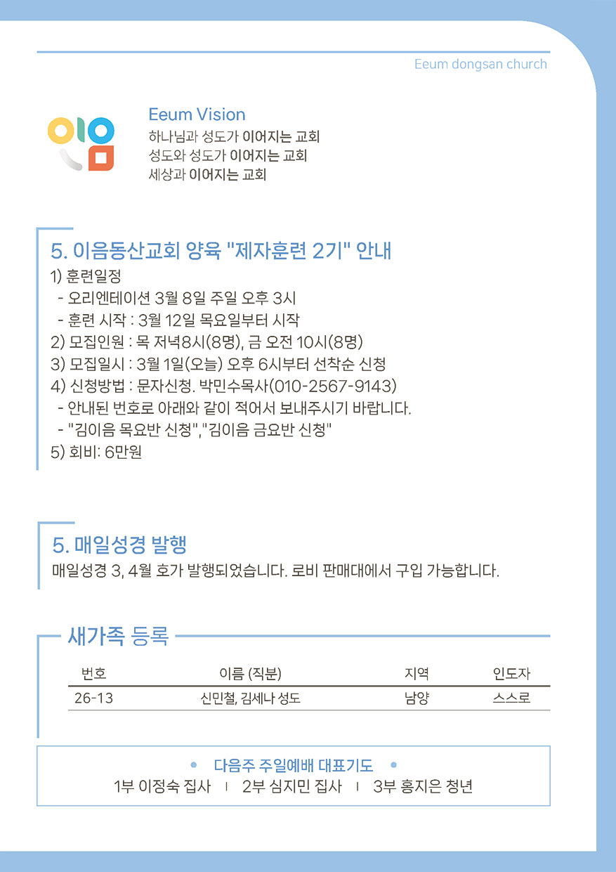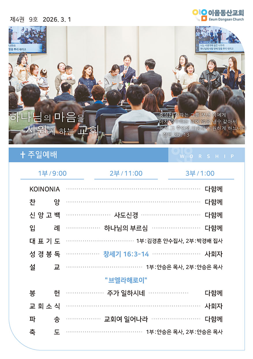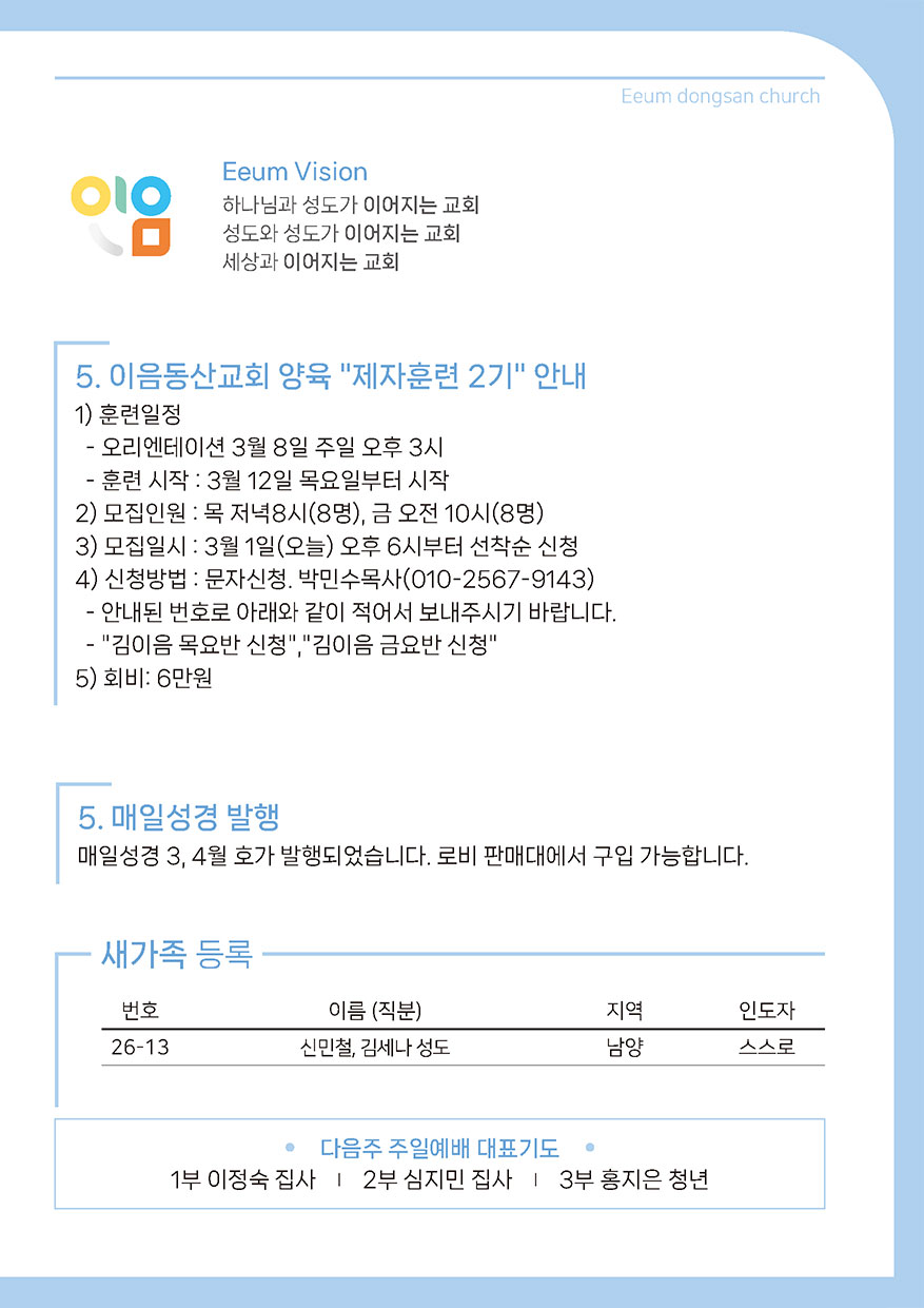 2026년 03월 01일 주일예배 주보 이음동산교회2026-02-28T14:43:55+09:00 관련 글 2026년 02월 22일 주일예배 주보 2026년 02월 22일 주일예배 주보 2026년 2월 19일 | 0 댓글 2026년 02월 15일 주일예배 주보 2026년 02월 15일 주일예배 주보 2026년 2월 14일 | 0 댓글 2026년 02월 08일 주일예배 주보 2026년 02월 08일 주일예배 주보 2026년 2월 6일 | 0 댓글 2026년 02월 01일 주일예배 주보 2026년 02월 01일 주일예배 주보 2026년 2월 2일 | 0 댓글 2026년 01월 25일 주일예배 주보 2026년 01월 25일 주일예배 주보 2026년 1월 23일 | 0 댓글